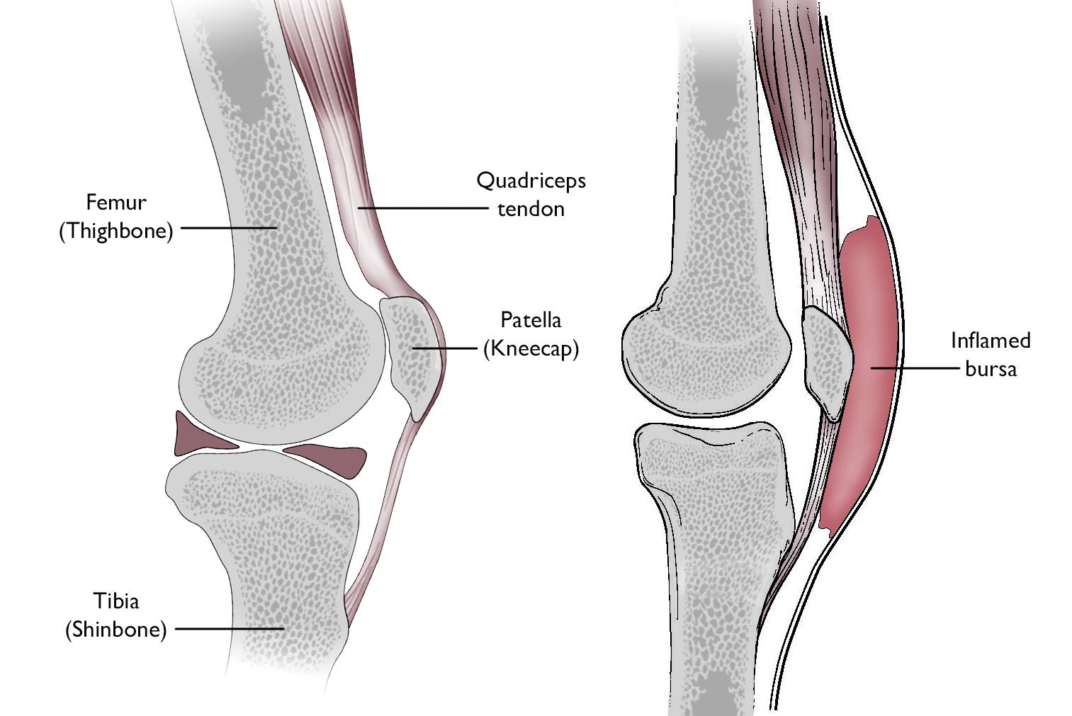 Disorders of the deep infrapatellar bursa are important to include in the differential diagnosis of anterior knee pain. To understand what causes knee bursitis, it is helpful to know more about the prepatellar bursa and bursae in general: A bursa is a sac made of thin, slippery tissue. Prepatellar bursitis housemaids knee swollen knee pain. Their function is to reduce .